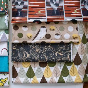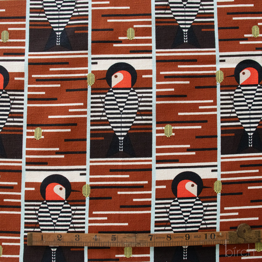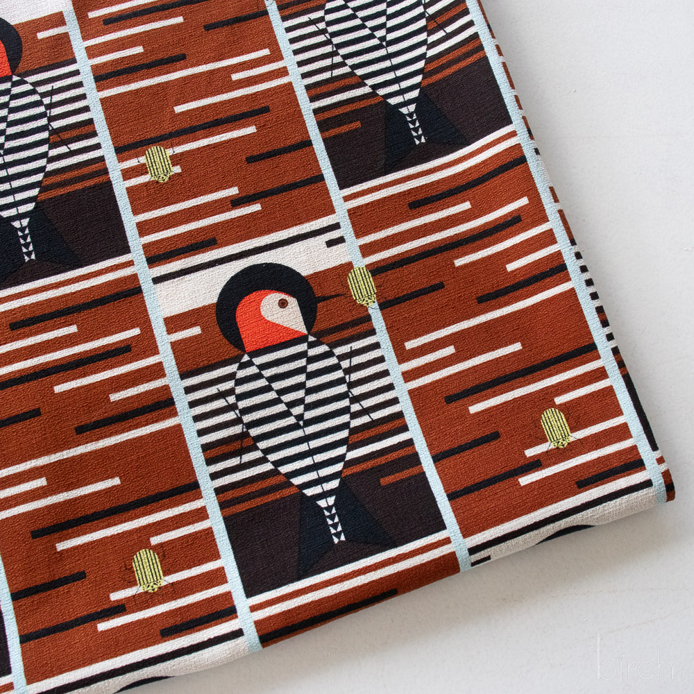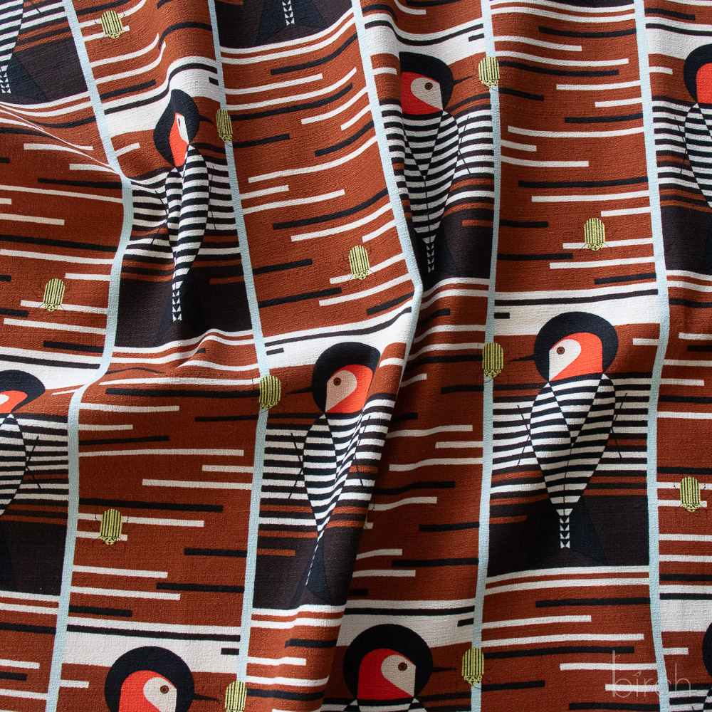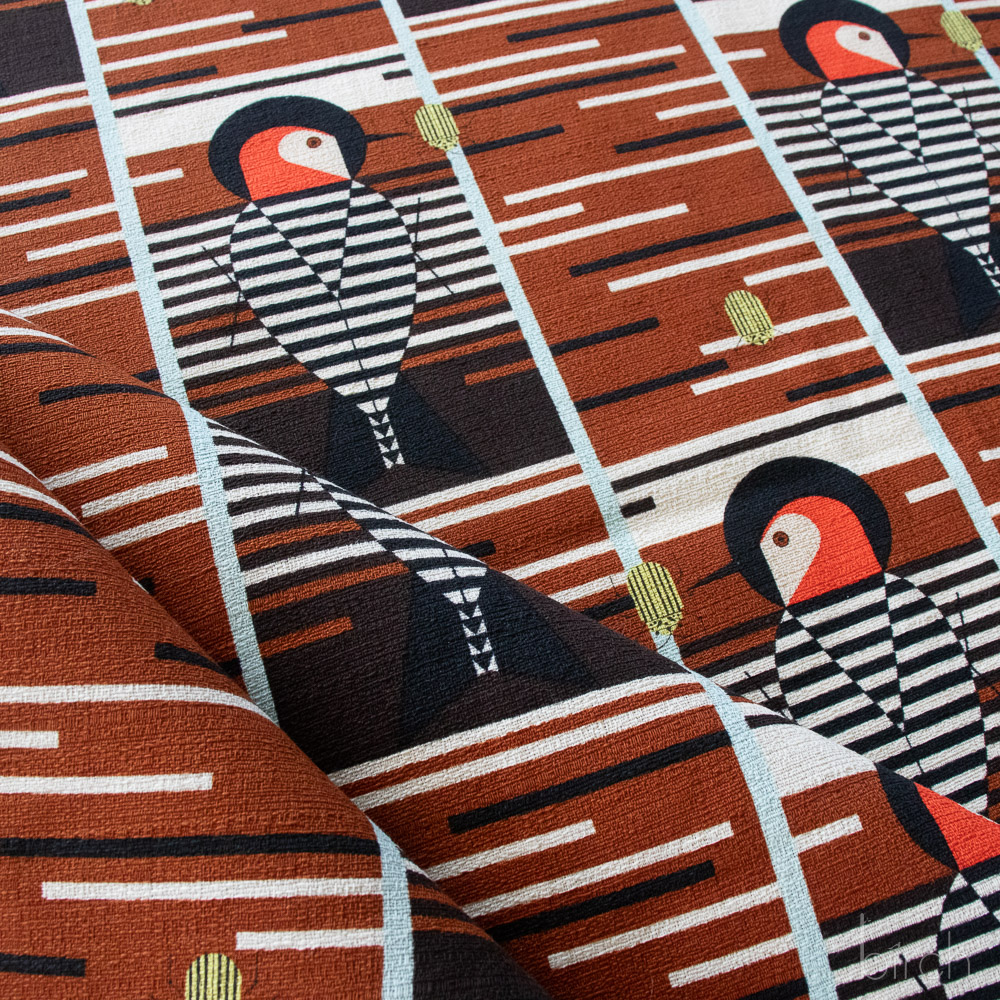 Baffling Belly Barkcloth is a cute woodpecker print featuring the feathered friend camouflaging itself on a tree. Warm brown, red, black and white are the main colors in this fabric, and there are yellow and black beetles crawling nearby. It is 56″ wide, 215gsm organic cotton barkcloth fabric.