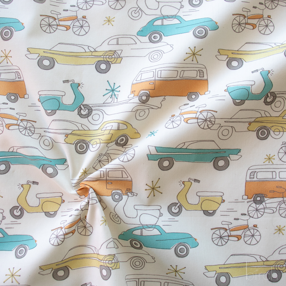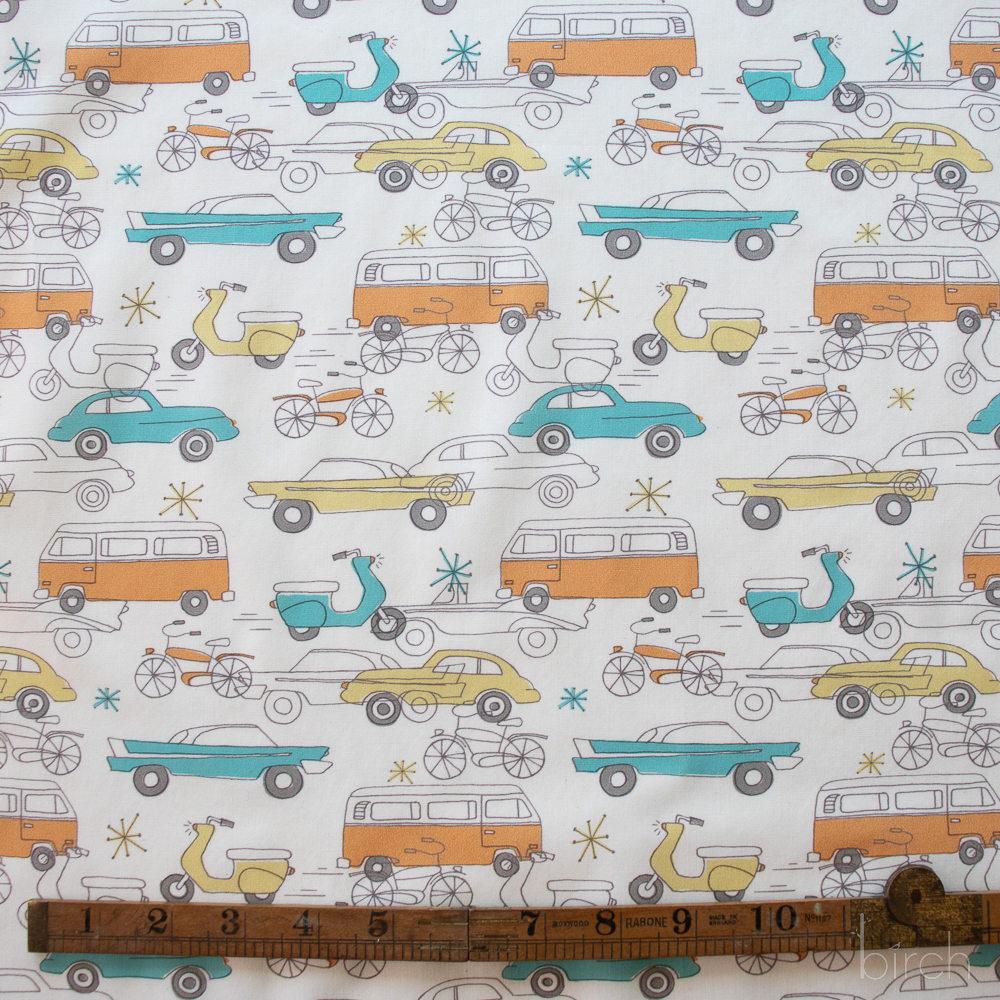 Cars Cream is an on the move design printed on organic cotton poplin fabric, with vintage cars, vans, bikes, and scooters.