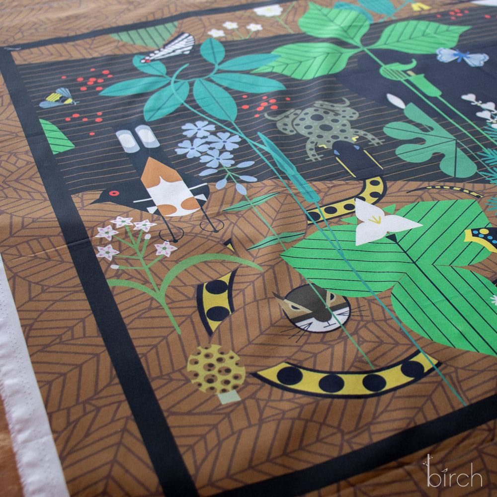 Woodland Wonders Poster Panel from Charley Harper Woodland Wonders is a digitally printed, 1 yard Poster Panel. Printed on Birch Organic Fabrics’ premium organic cotton poplin, this new poster panel features a look into some fun flora and fauna like woodpecker, fox, flowers, fungi, insects, rodents and more!