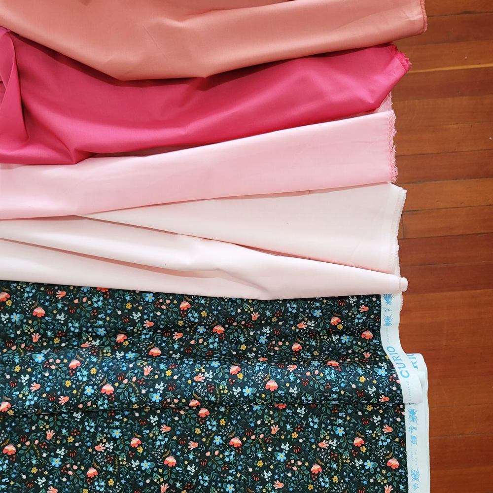 Introducing a fun new quilt bundle to accompany Ritual Quilt Company’s most recent release, Heirloom Rings! Heirloom Rings Floral Quilt Bundle is a simple yet striking and fun to sew pattern features 4 beautiful Birch Poplin Solids and Bramble Fields Hunter to create a beautiful contrast of pinks on a dark floral background! We sure hope you’ll be inspired by this happy kit! Find the Heirloom Rings Quilt Pattern here!