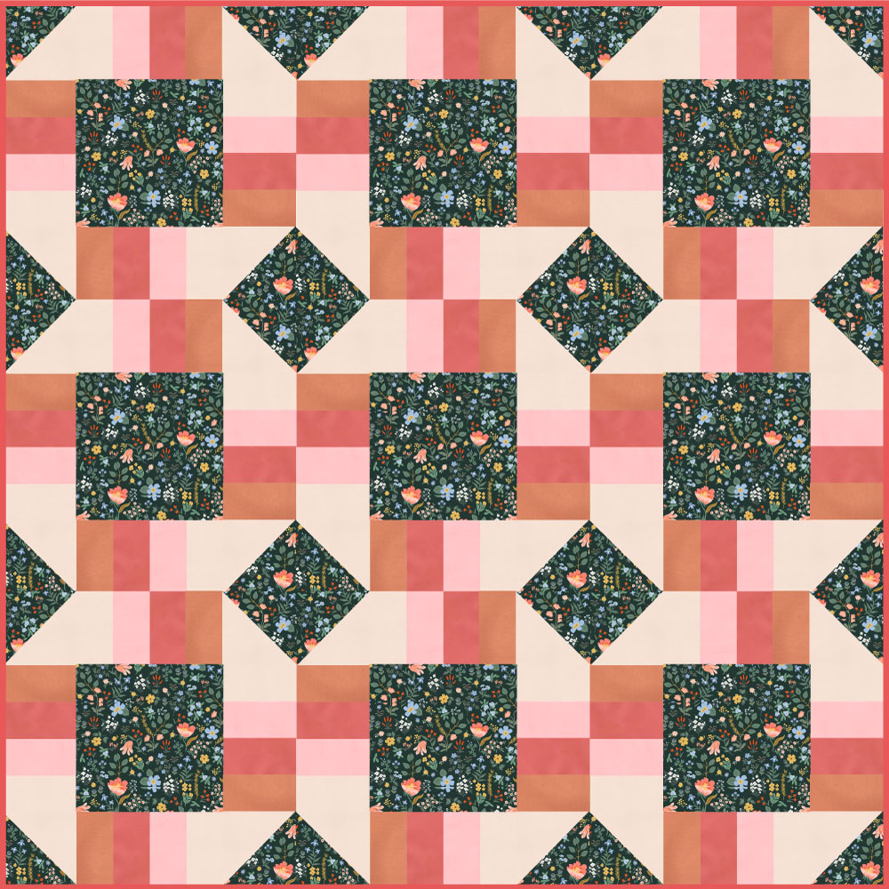 You will receive 1 yd of Blush and a 1/2 yd of Apricot Brandy, Holly Berry, and Pink Birch Organic Solid Poplins, with 1 1/2 yards of Bramble Fields Hunter for the background fabric (Fabric E). We used Holly Berry solid poplin as the binding in the mock up, which is not included.
