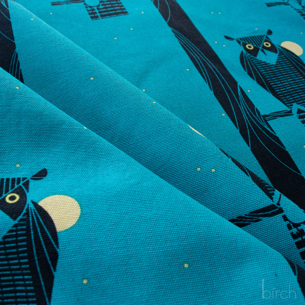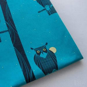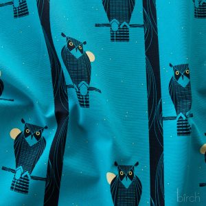 Moon Owl Canvas features black perched owls on a rich blue, starry, moonlit night. It is 48/50″ wide, 260gsm organic cotton canvas fabric.