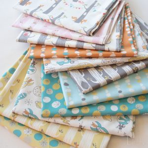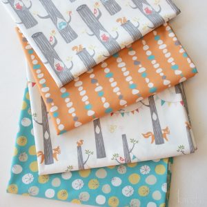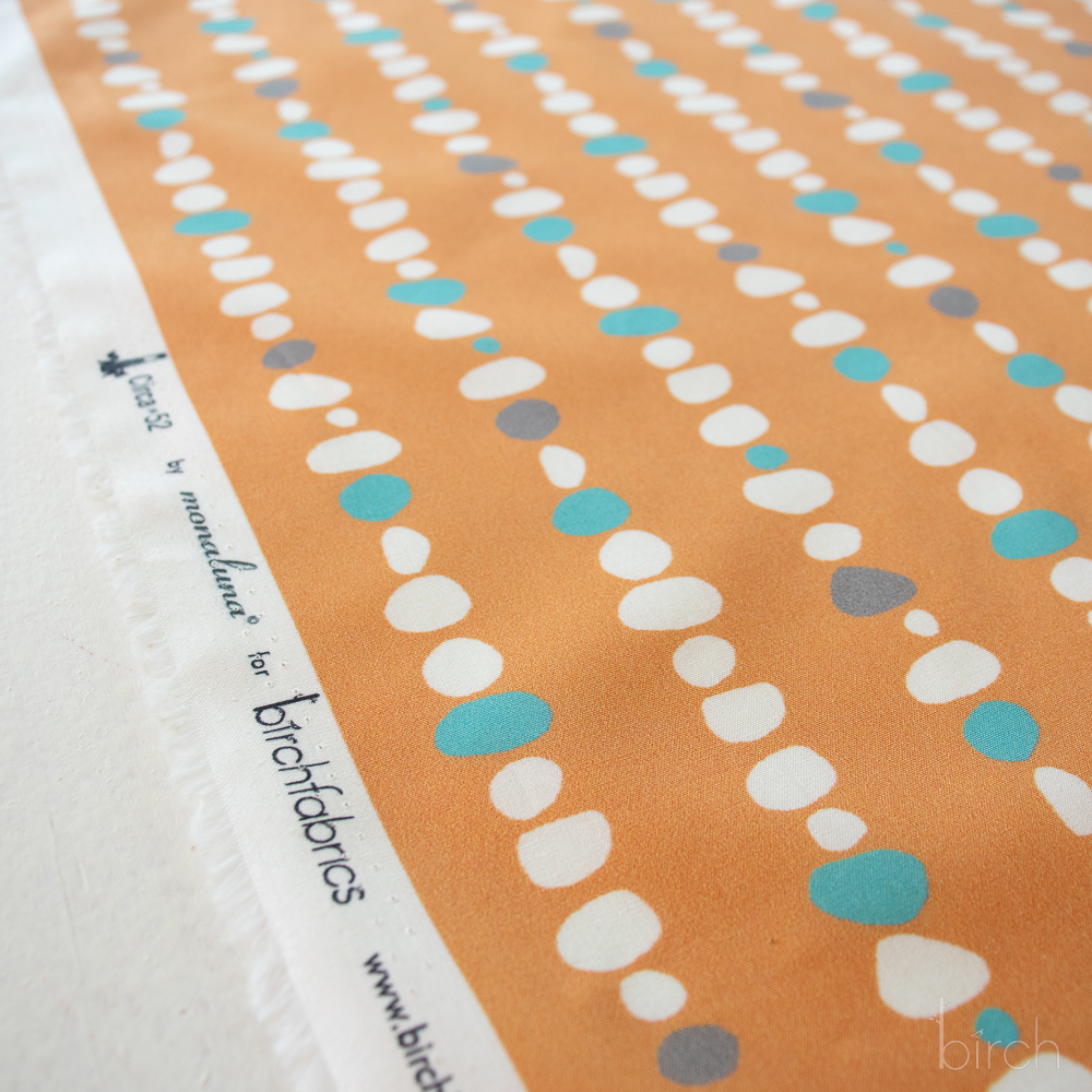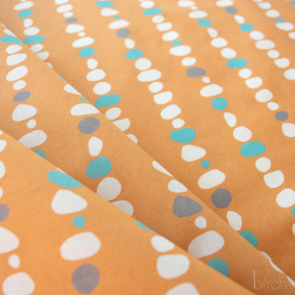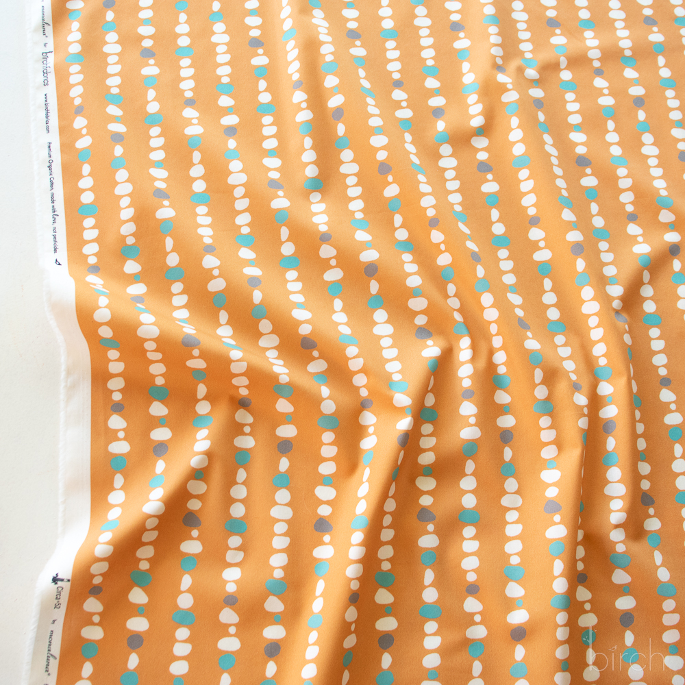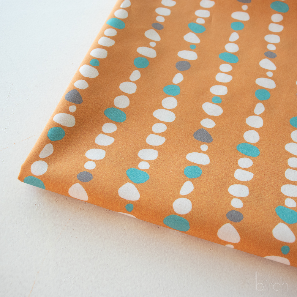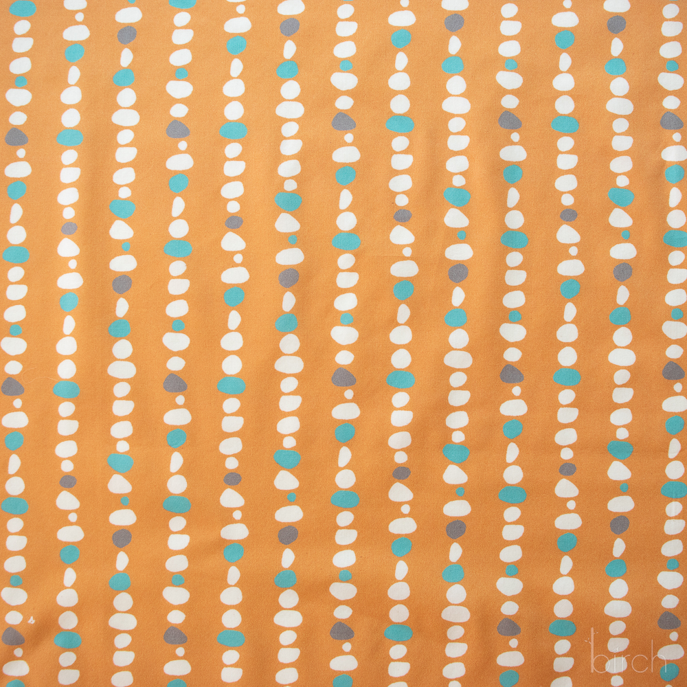 Pebble Lines Pumpkin is a great blender fro this organic cotton poplin fabric collection. Orange background, with white, dark grey, and teal rock or beadlike shapes creating lines.