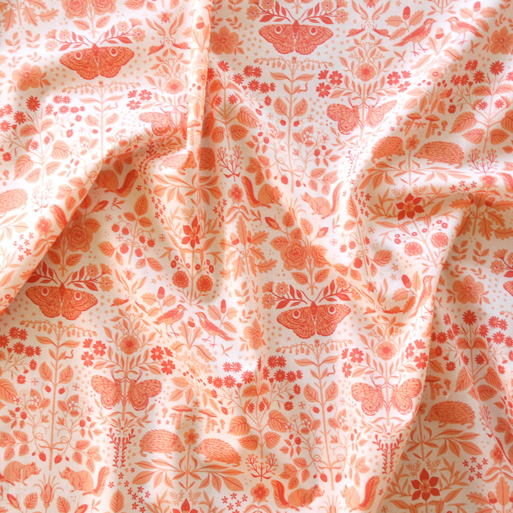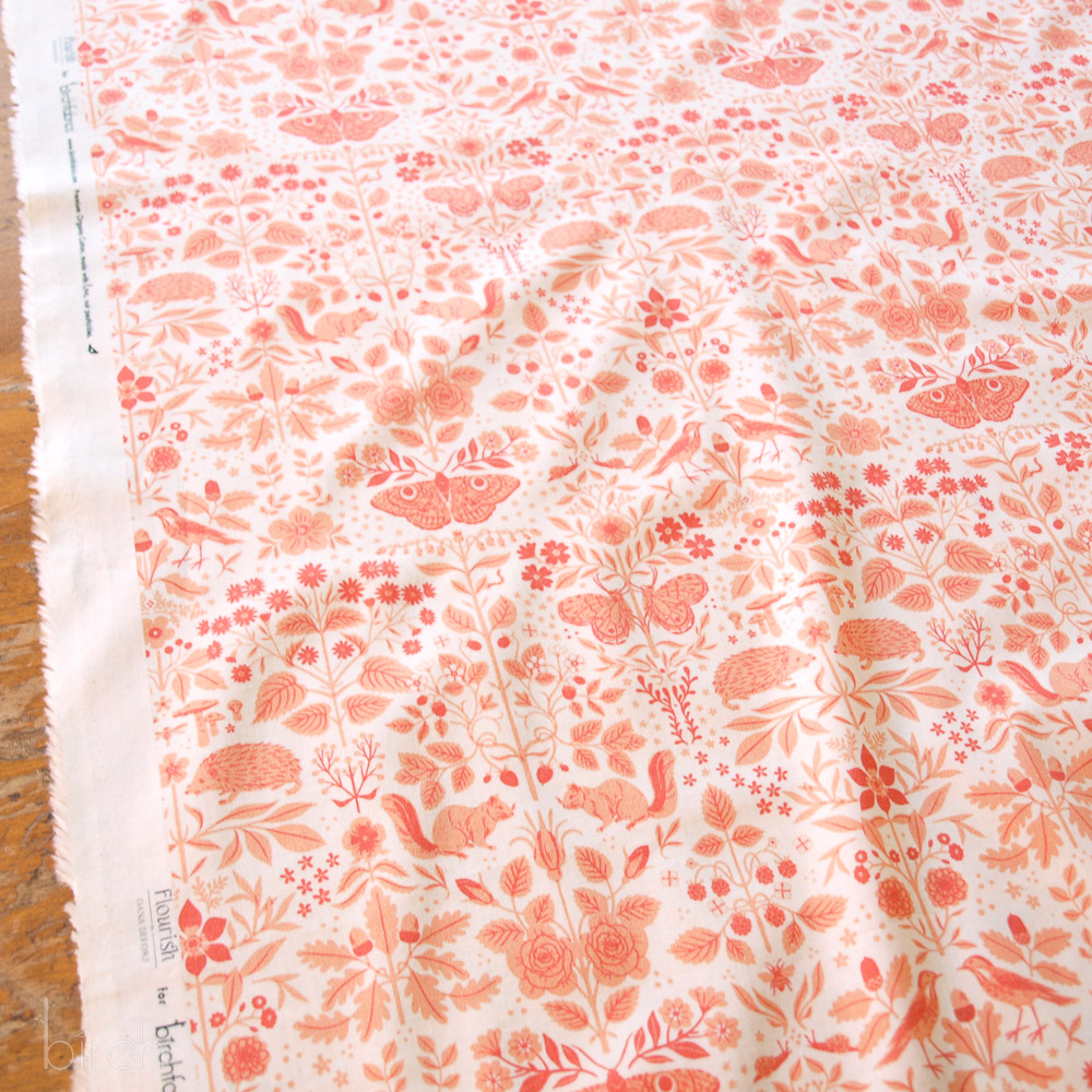 Flora and Fauna Nectar is a part of Oana Befort’s follow up collection to Flowering Trees, with a striking earthy and warm palette. Flourish features delicate mushrooms, daisies, and nasturtiums live alongside playful flora and fauna to complete a harmonious habitat of flowing lawn prints.