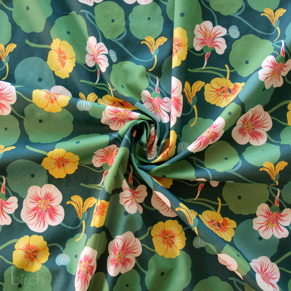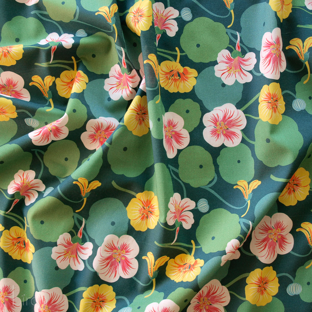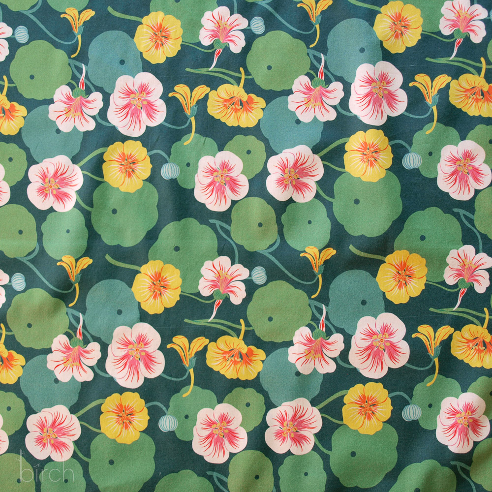 Nasturtiums is a part of Oana Befort’s follow up collection to Flowering Trees, with a striking earthy and warm palette. Flourish features delicate mushrooms, daisies, and nasturtiums live alongside playful flora and fauna to complete a harmonious habitat of flowing lawn prints.