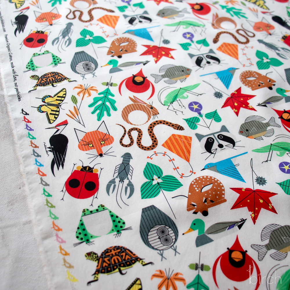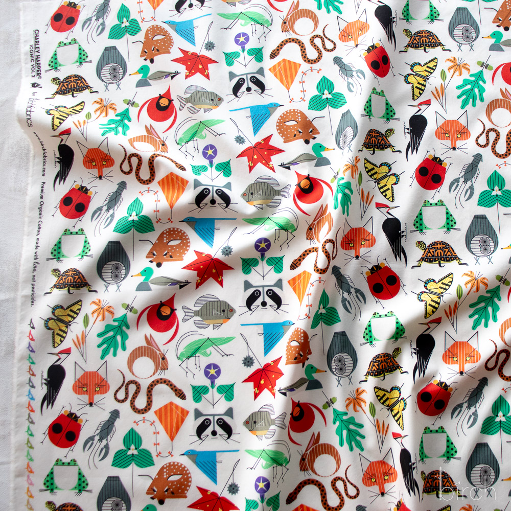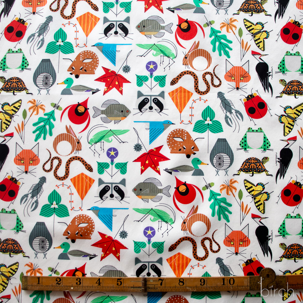 Small Space For All Species by Charley Harper features a vibrant mix of plants and animals set against an unbleached natural cream background. Printed on organic cotton poplin, this bright and colorful fabric offers a soft, durable surface ideal for quilting, apparel, and crafts. Its lively design and sustainable fabric make it an excellent choice for detailed, expert-level projects.