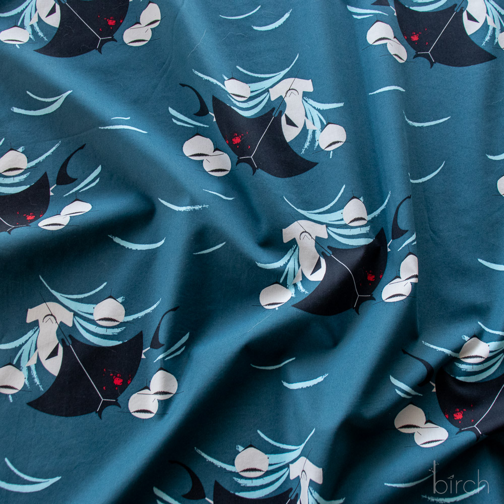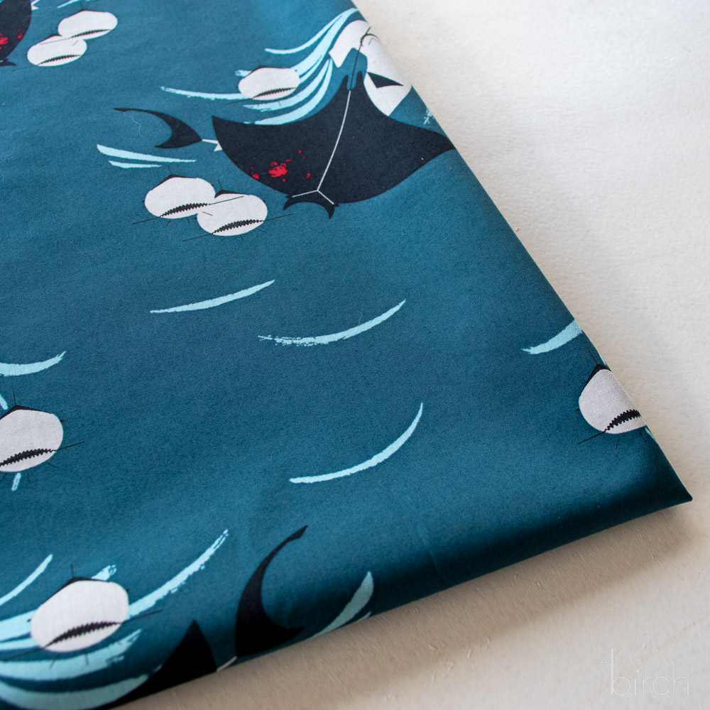 We are very excited about this unique print, Shark Feast. All those sharks hunting the majestic ray on a mid blue backdrop is certainly a mood and shows the food chain at work.