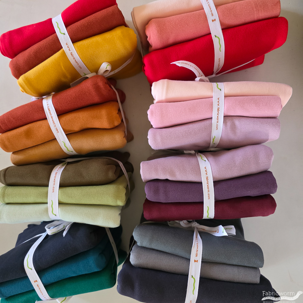 Need a fun bundle of solid knits? Here are the Birch Organic, 58″ wide, Solid Interlock Knit Bundles featuring 3 coordinating colors each. Great for kids’ clothes, color blocking t-shirts, baby beanies or bow headbands, or whatever else you like to do with a minimum of a 1/2yd cut of knit.