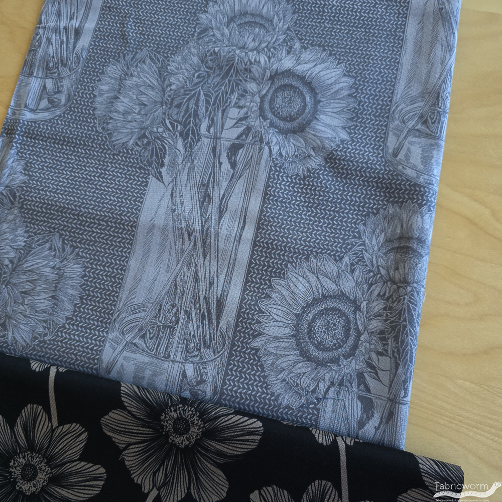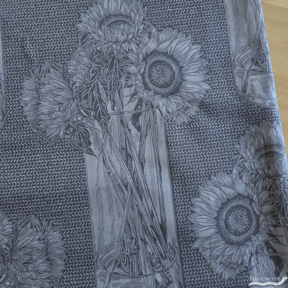 Sunflowers Flash is a fabric from Anna Maria with vases of sunflowers in tone on tone greys. Each vase bouquet is 7″ wide, and 11.5″ tall.