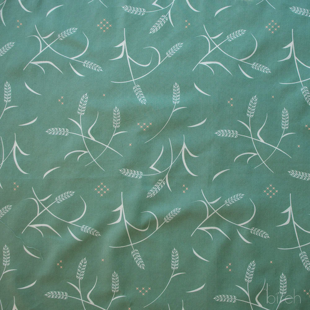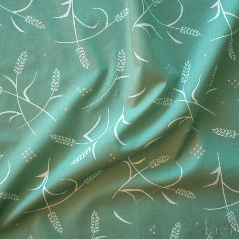 Tossed Wheat Green is a print featuring cream colored wheat on a green background. These fine, organic poplin fabrics can be used for quilting and more, but this print would look great as a prairie dress, western button-up shirt, or skirt. This fabric is part of the collection, Tall Tales Vol. 2 by Arleen Serge for Birch Organic Fabrics.