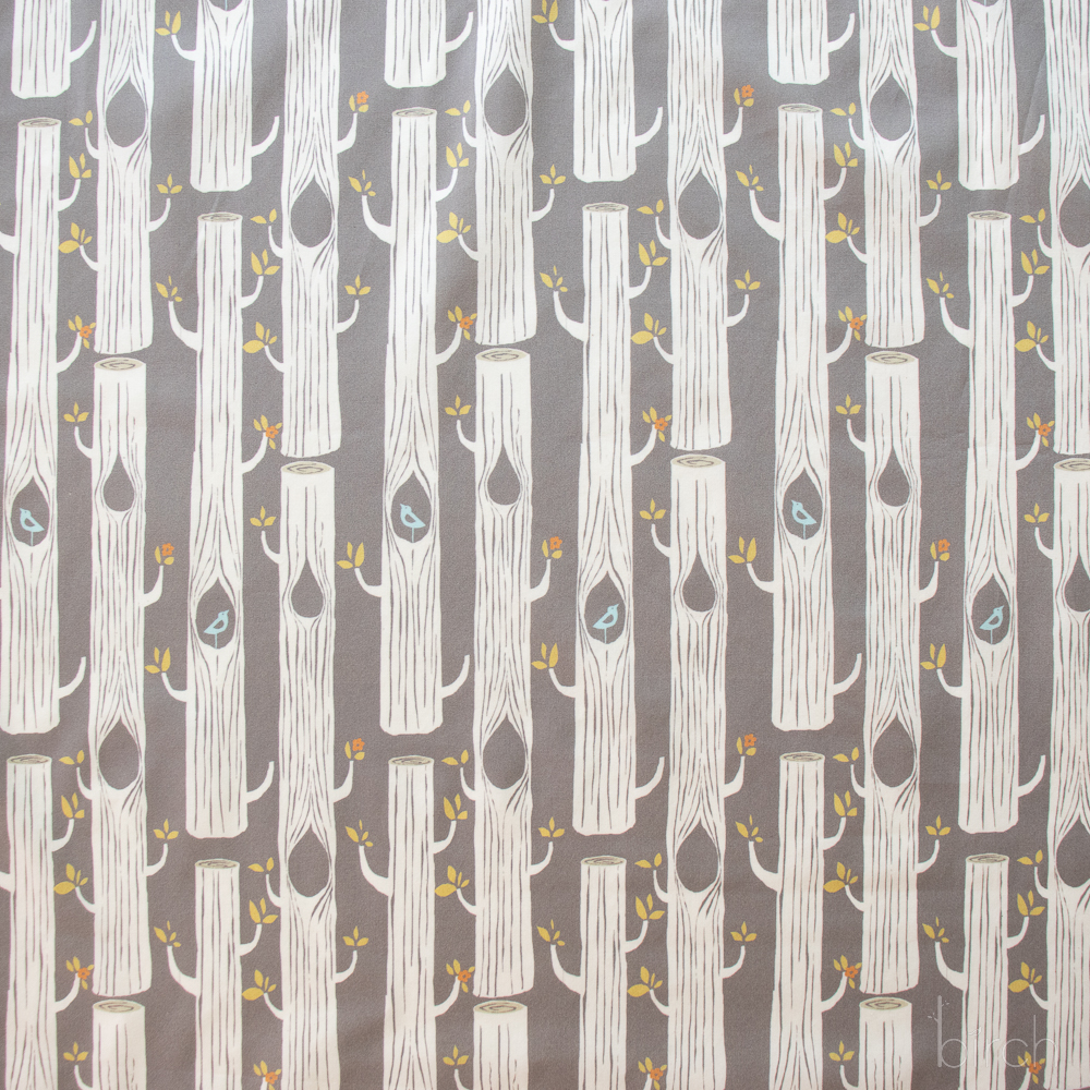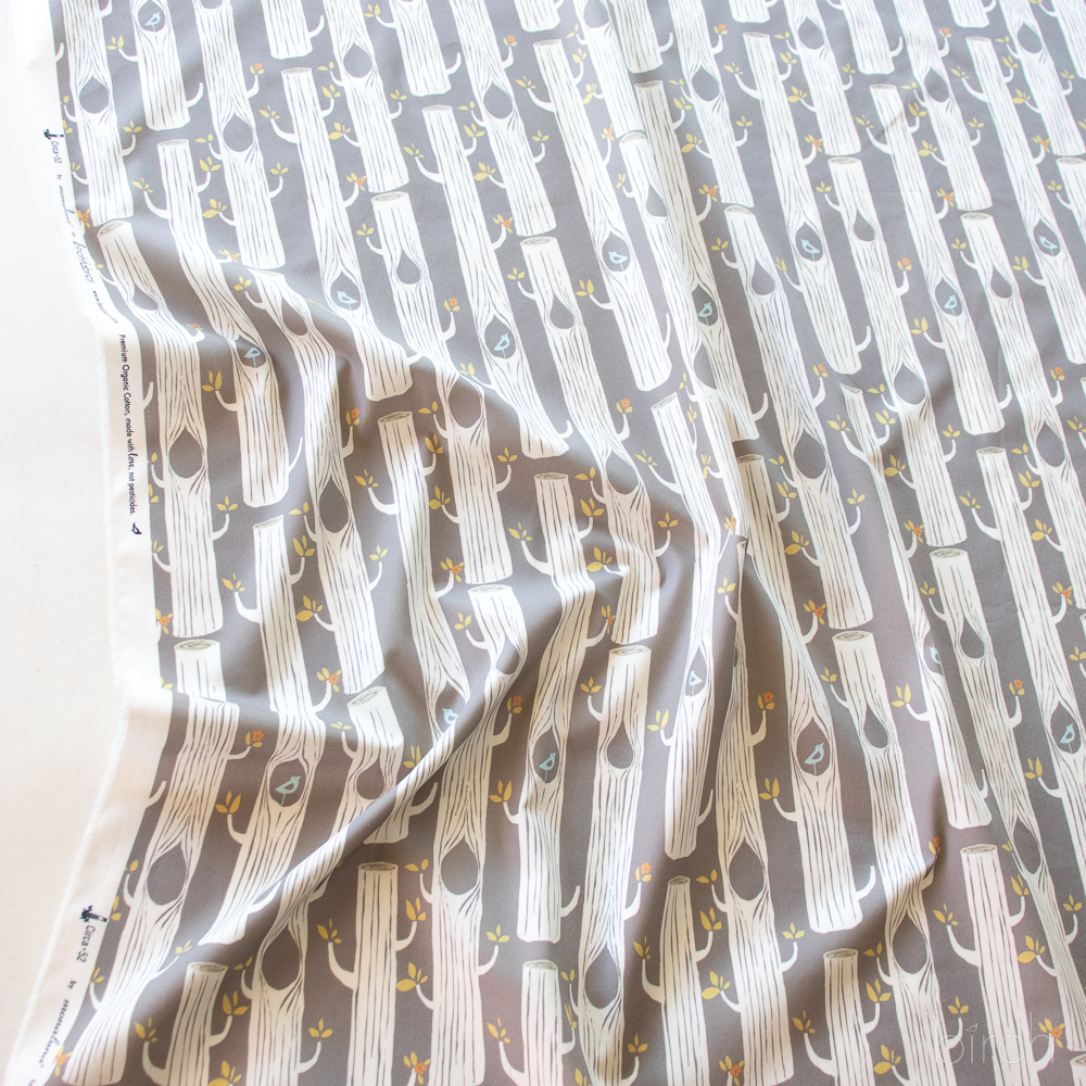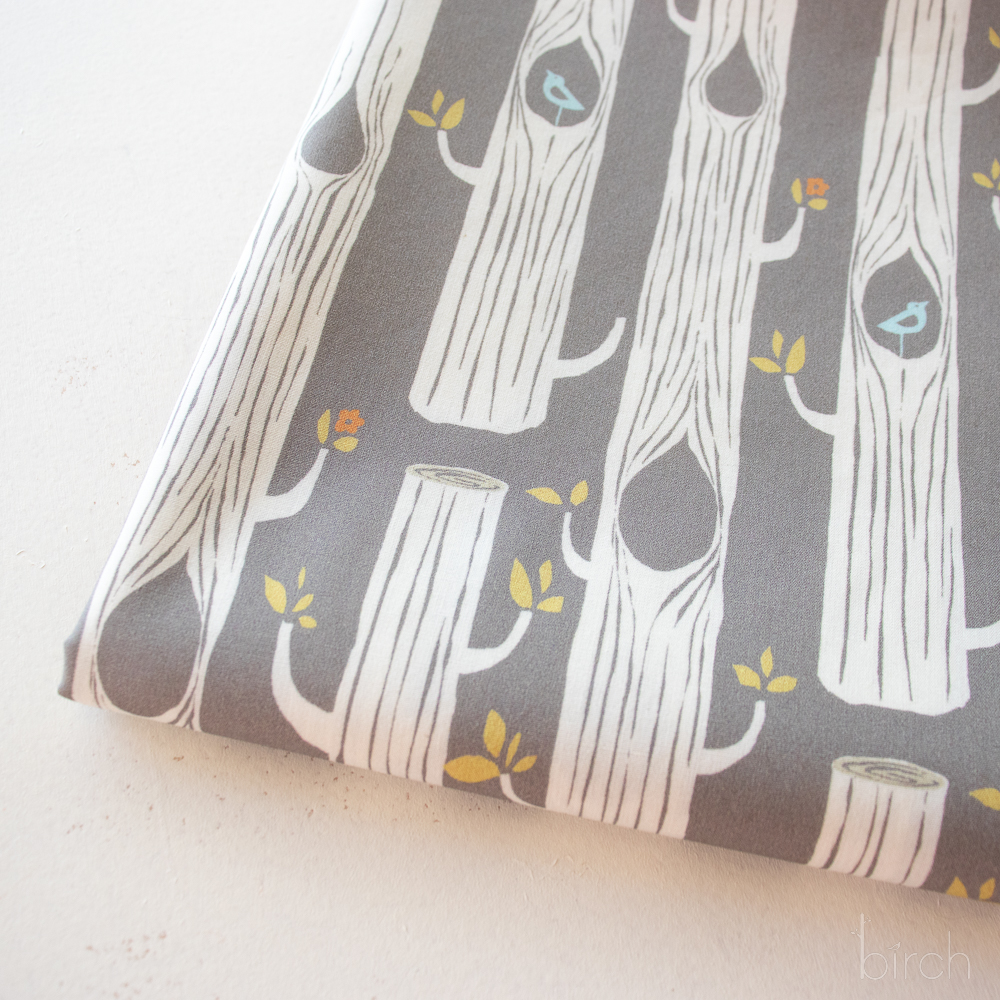 Tree Stripes Shroom features logs with limbs and hollows where birds are perched. This lovely organic cotton poplin fabric is printed with a dark grey background and white trees with color accents in the leaves and birds.
