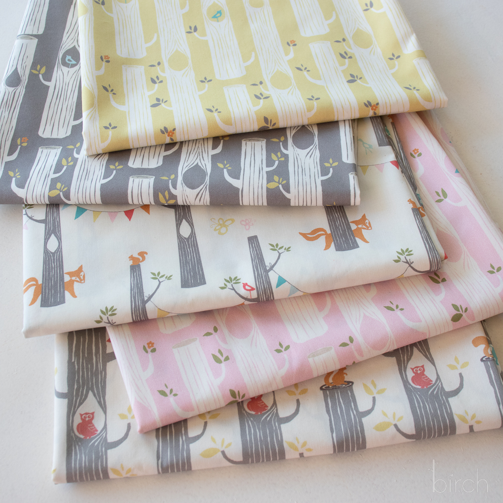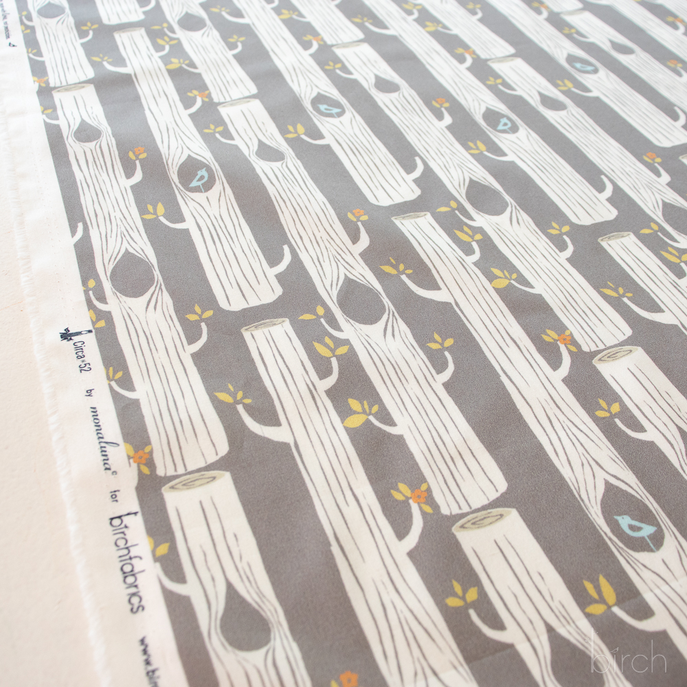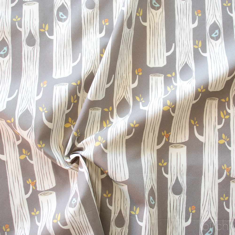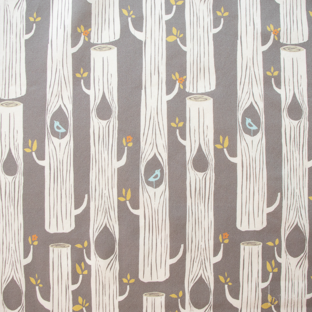 Tree Stripes Shroom features logs with limbs and hollows where birds are perched. This lovely organic cotton poplin fabric is printed with a dark grey background and white trees with color accents in the leaves and birds.