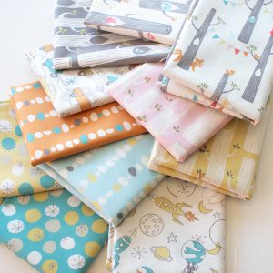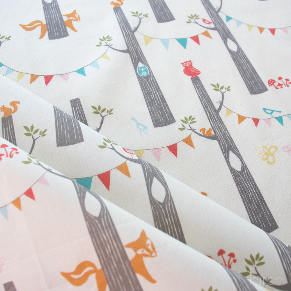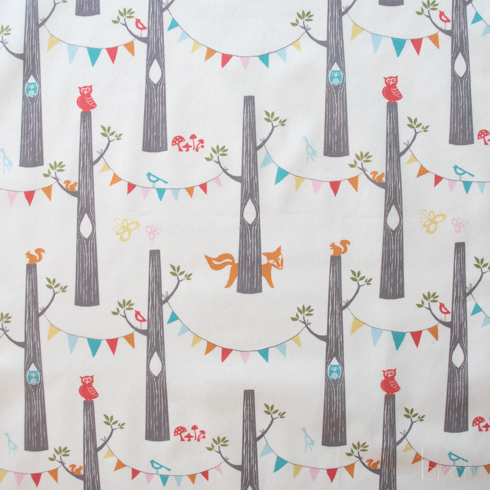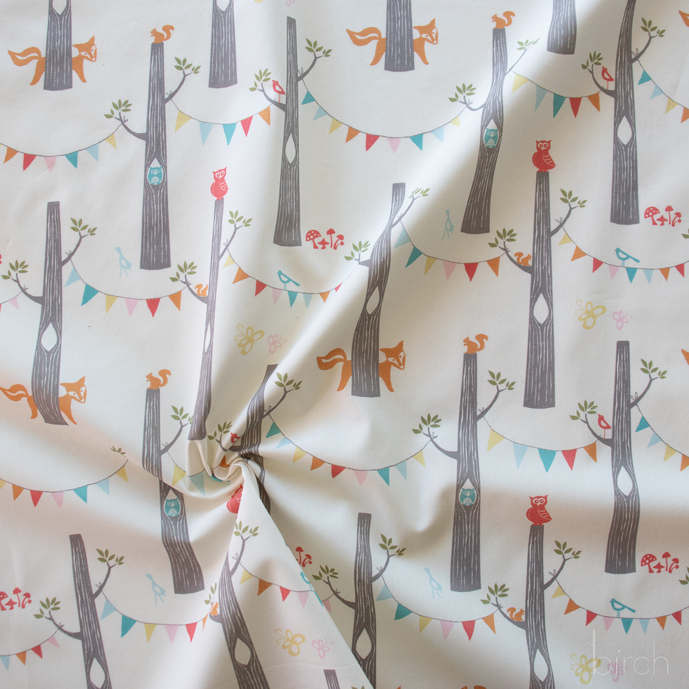 Woodland Party Cream is the starof this collection with it’s festive bunting between tress, owls, squirrels, birds, butterflies and foxes ready to celebrate! Use this soft organic cotton poplin fabric for whatever your heart dreams up!