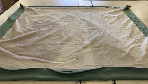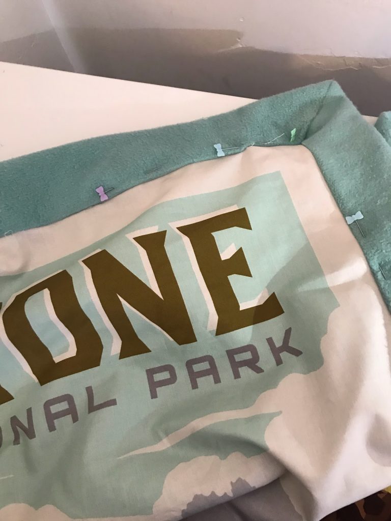 - Pin your top and bottom edges, leaving 5” inches over on each side edge.