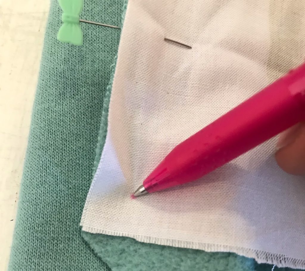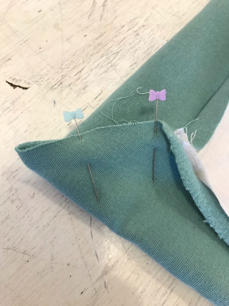 - Starting in one corner, pin the fleece corner starting at the marking point, and ending at the folded edge. Repeat pinning process in all corners.